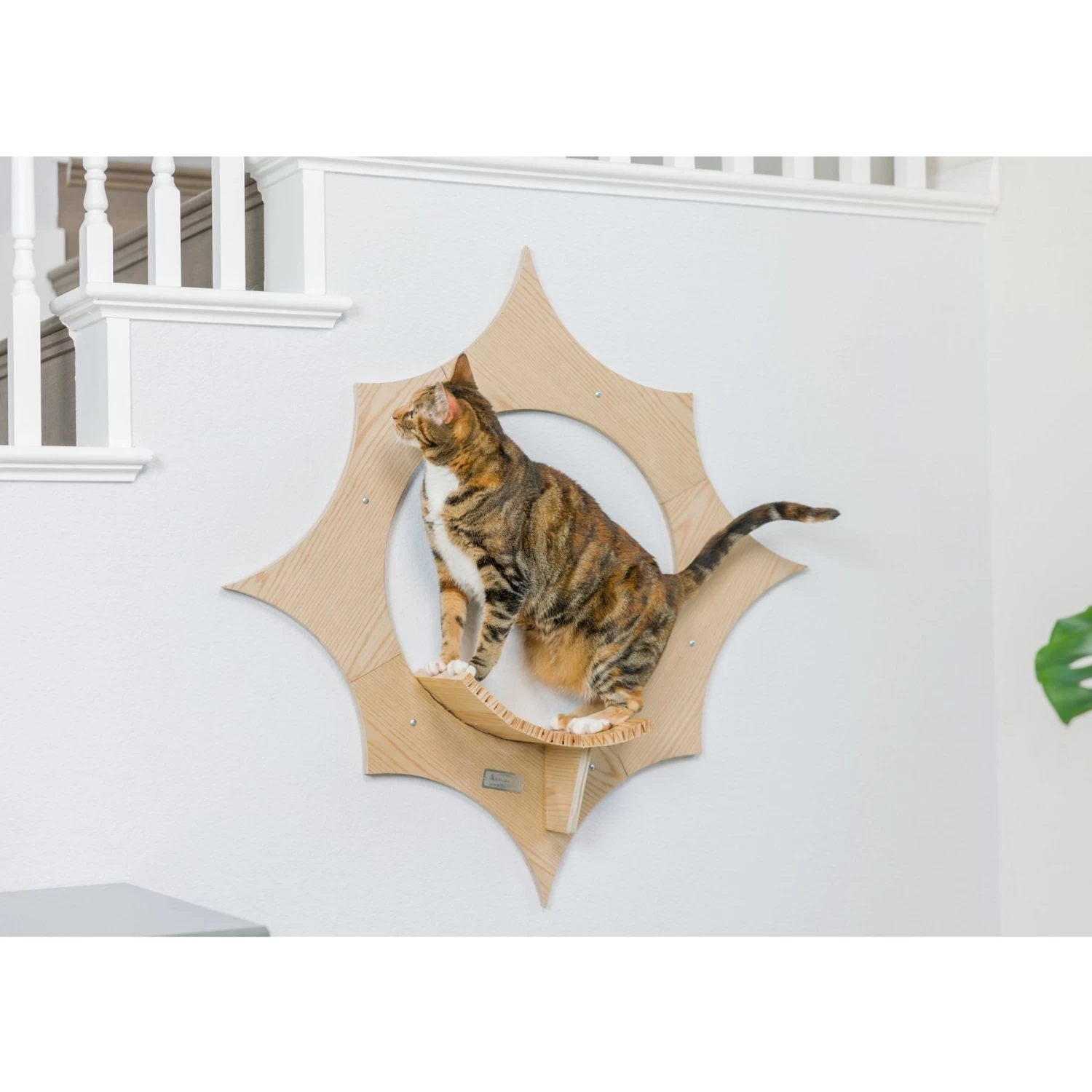 - Sun-shaped cat shelf made of solid poplar layered wood.