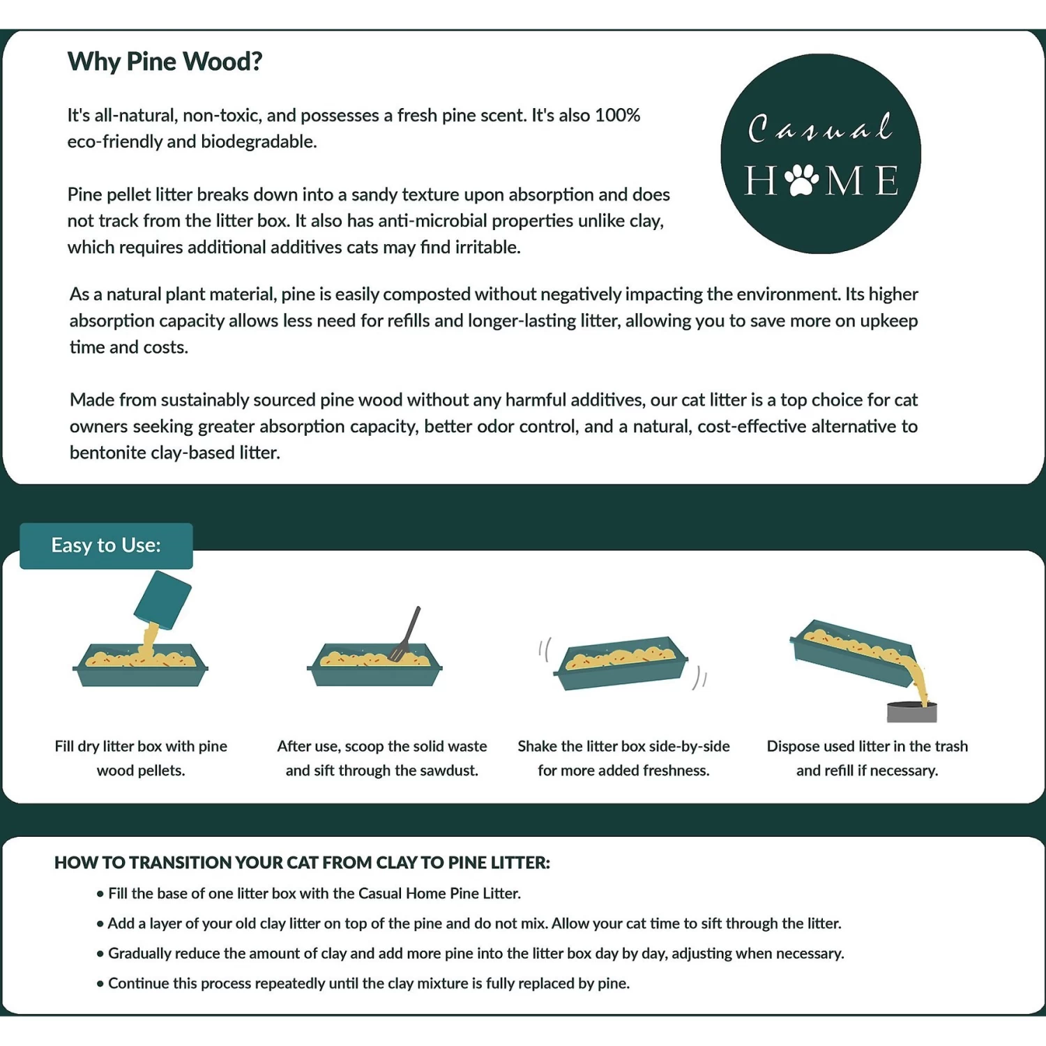 - All-natural, pinewood litter is highly-absorbent to quickly trap odors and liquid.
