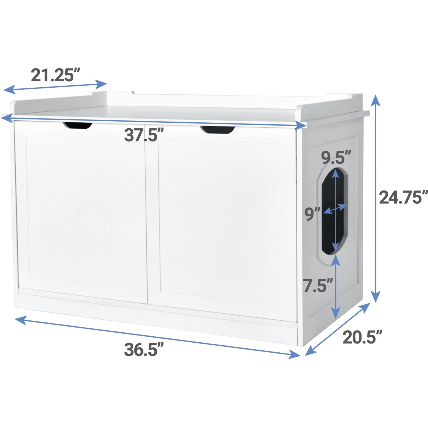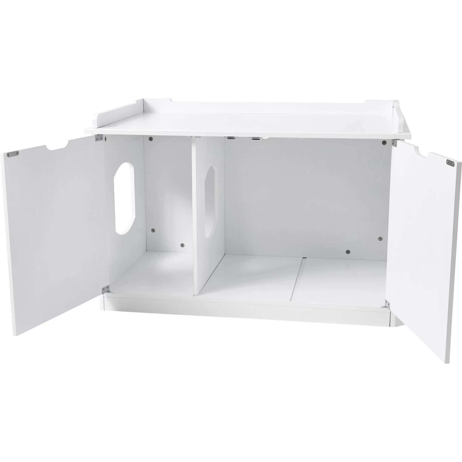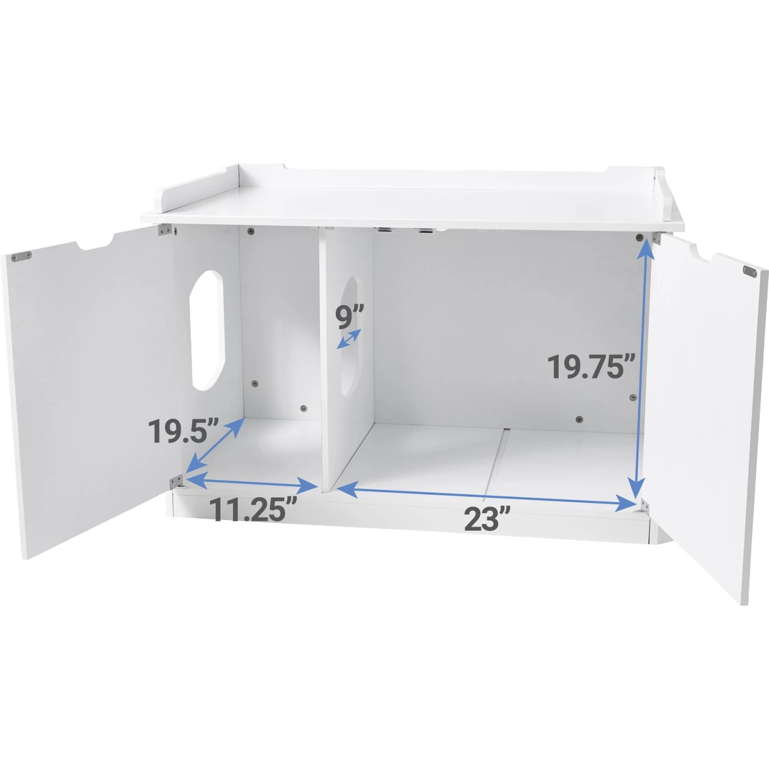 plus built-in doors with hinges that open wide for easy access to the litter box. - Includes removable divider that can be set up in 3 different positions to store essentials like food, treats, cleanup tools or left out to maximize interior space.