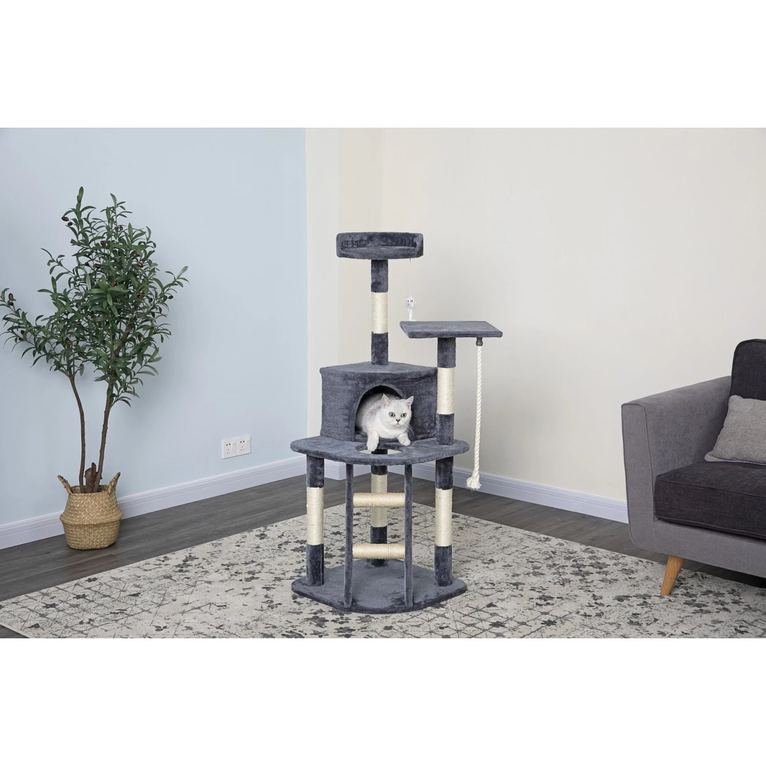 - This tree features a dangly rope and hanging toy mouse to stimulate physical and mental activity.