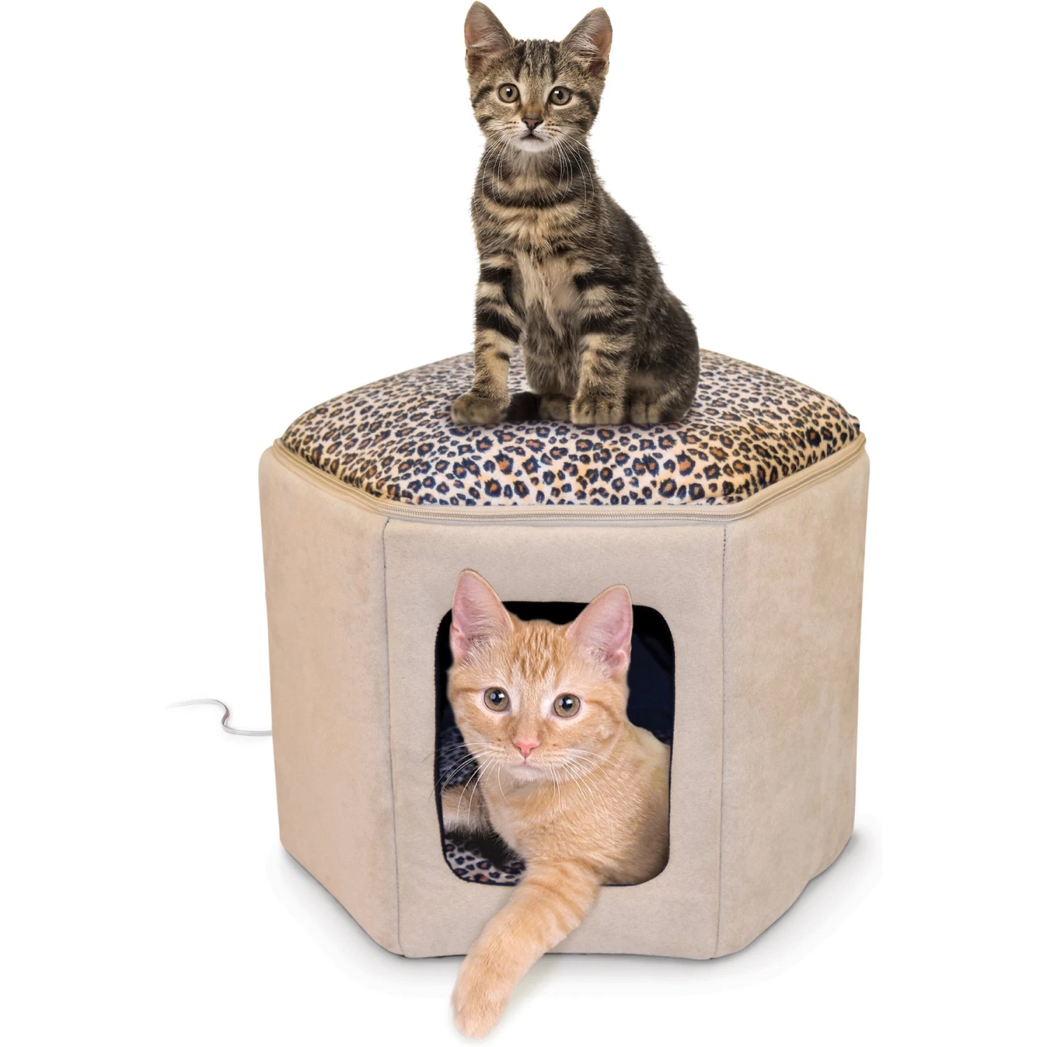 - Stylish leopard print makes this a great hideaway for your cat’s inner fashionista.