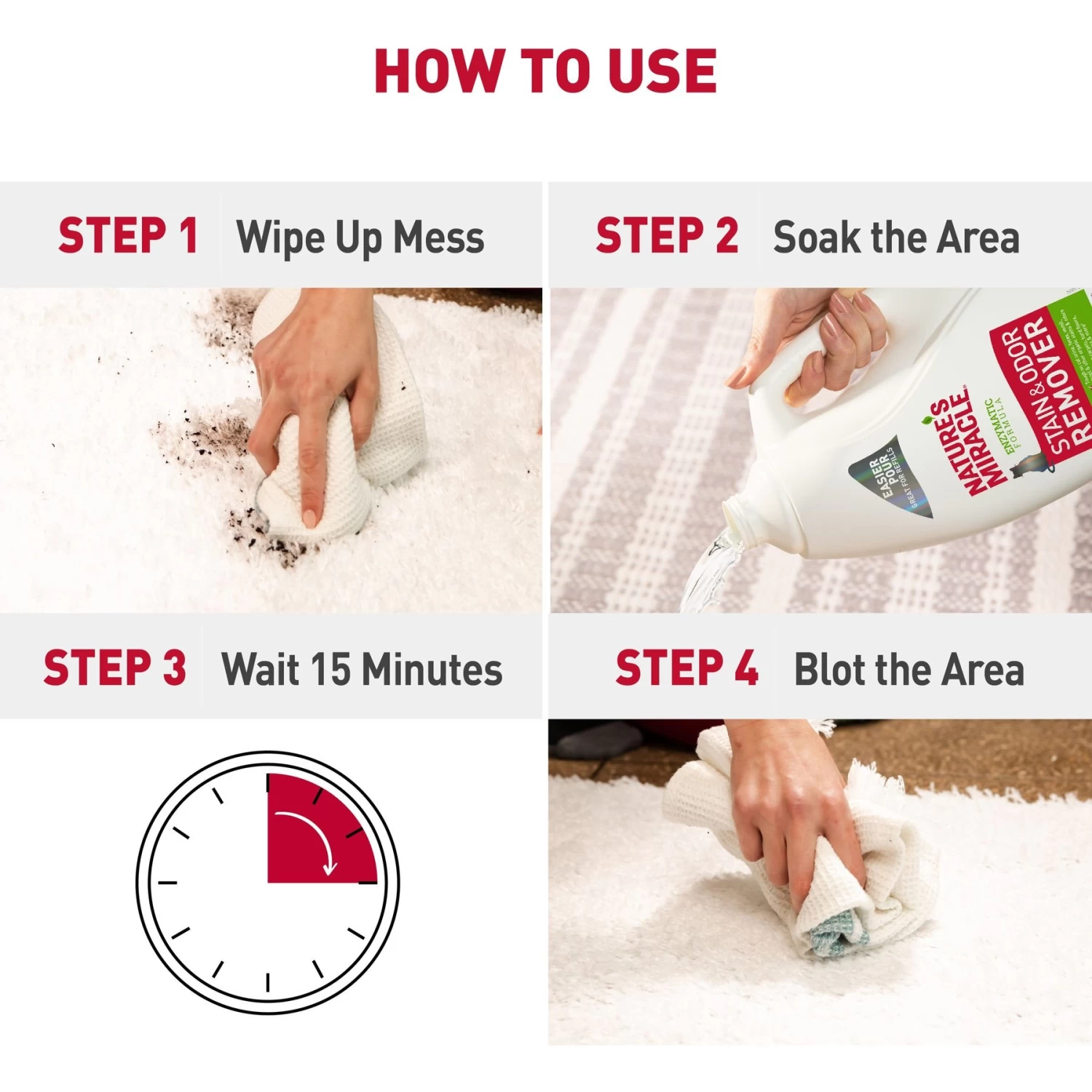 Stain removal: Wipe away any excess stain-causing material, then soak the surface thoroughly with Nature’s Miracle® Just for Cats™ Stain and Odor Remover. Wait 5 minutes, then wipe away stain with a cloth. For tough stains, use a stiff, bristle brush. If the stain is not completely removed, re-soak area and allow to work for 1 hour before wiping with a cloth.
