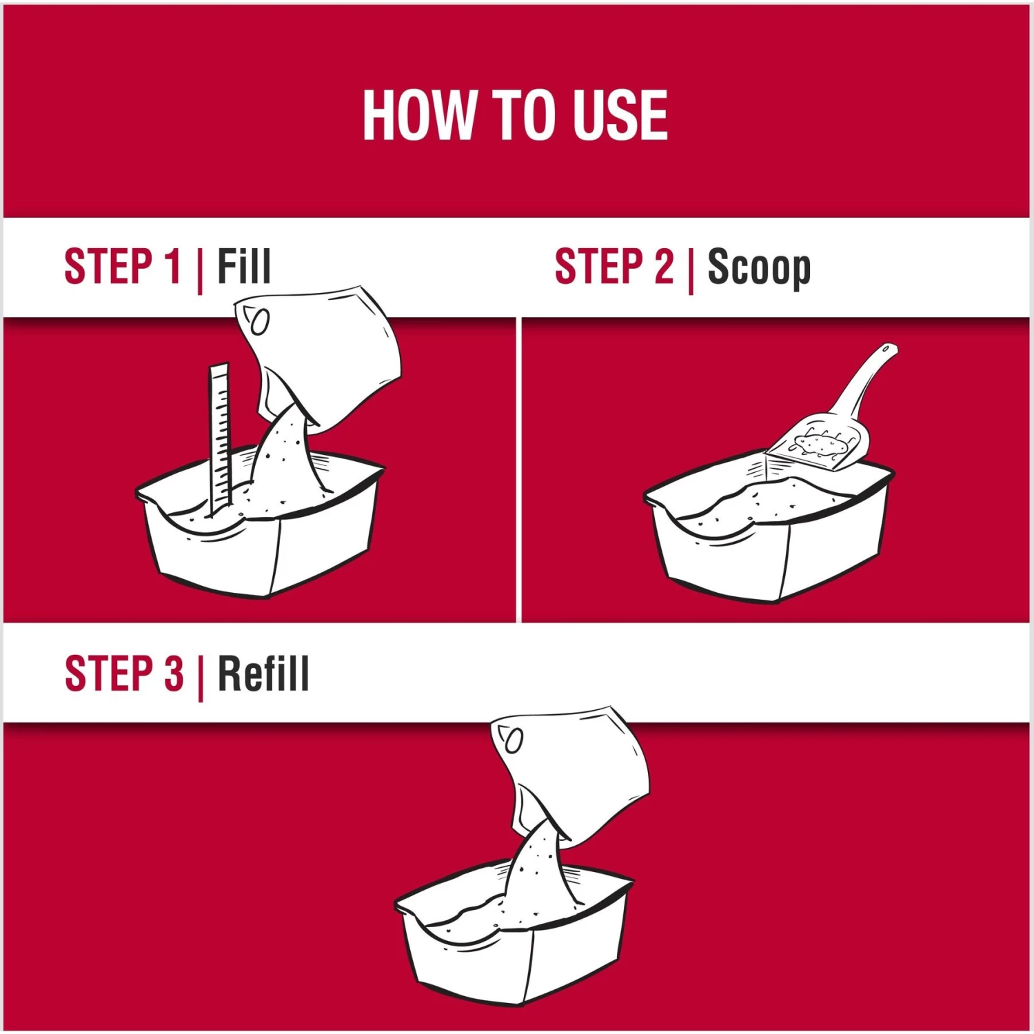 • Fill litter box 2-3 inches deep with litter. Scoop clumps and remove waste daily to ensure maximum freshness and odor control. Add more litter to maintain depth of 2-3 inches.