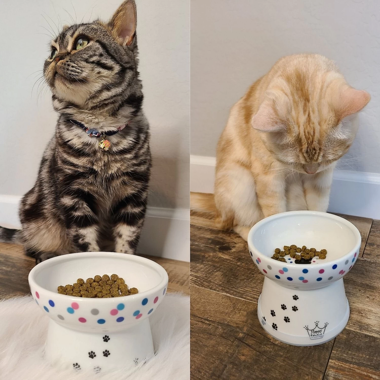 - Elevated cat bowl that shows off your kitty’s paw-sonality.