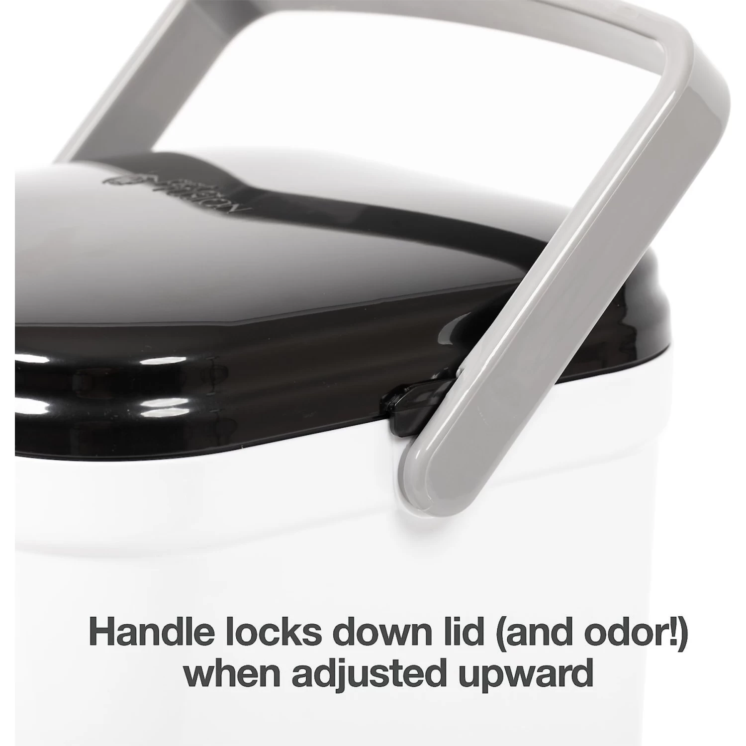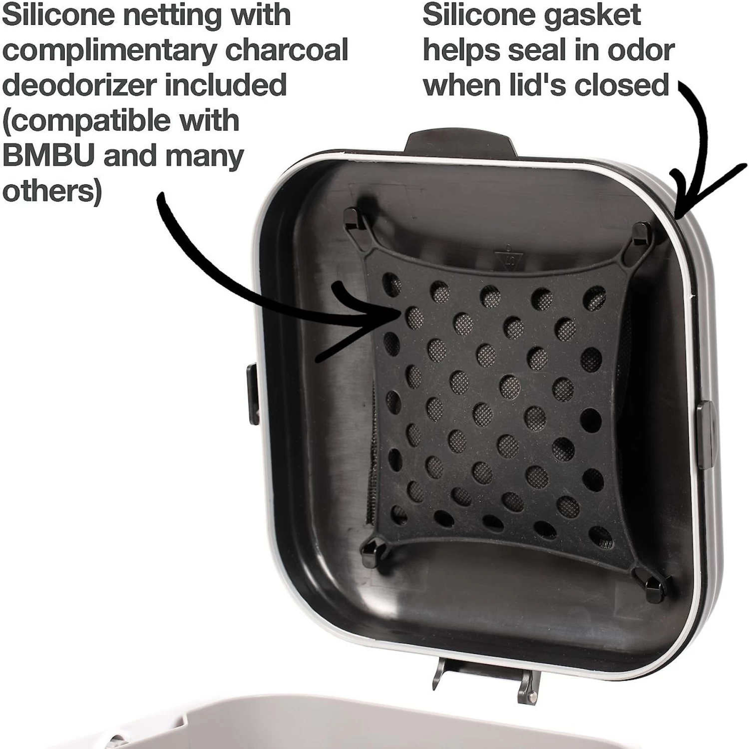 - Features a locking handle, silicone gasket, and non-toxic charcoal deodorizer that lasts up to 6 months.