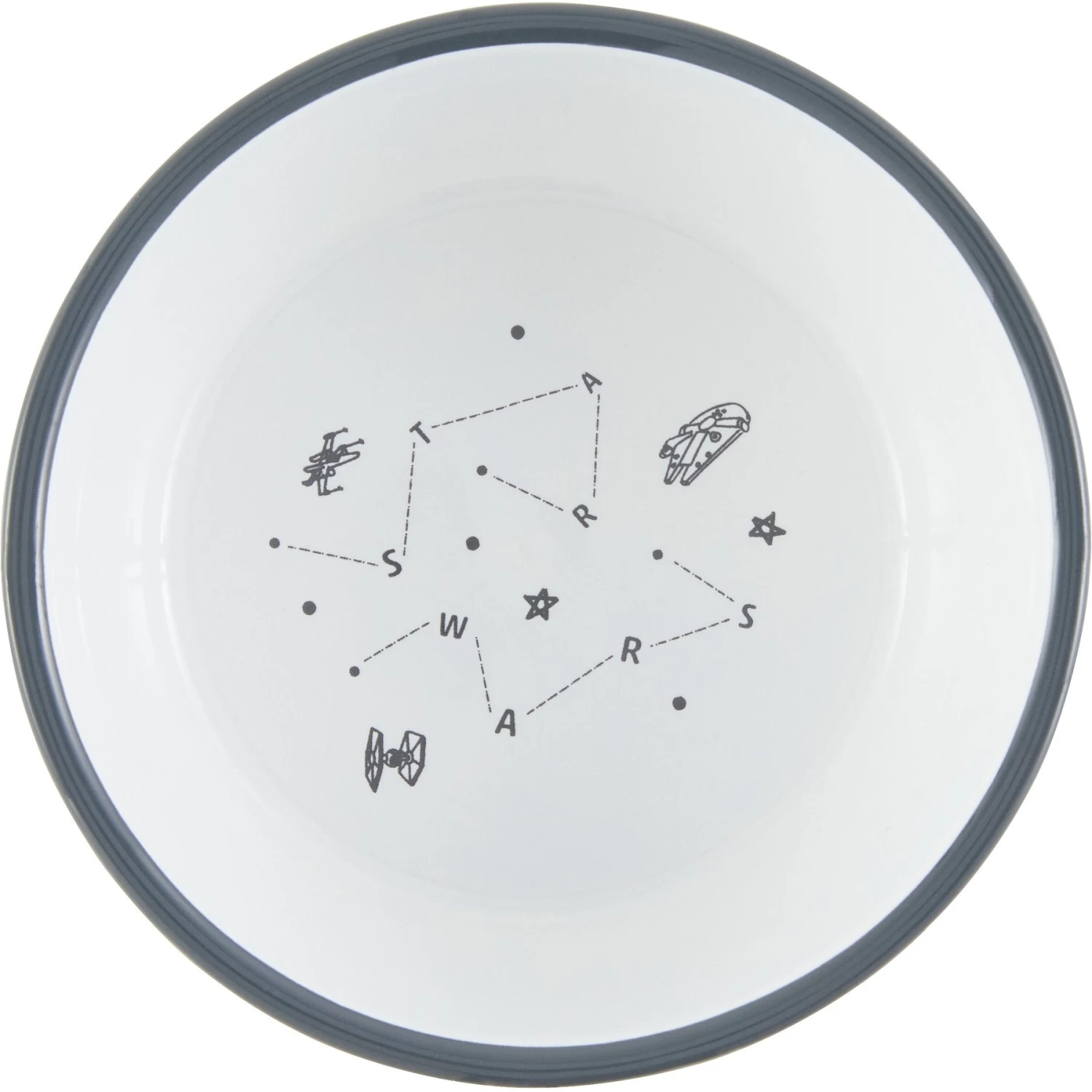 - Modern-style cat bowl with a STAR WARS-themed pattern featuring X-Wings, Tie Fighters and the Millennium Falcon.