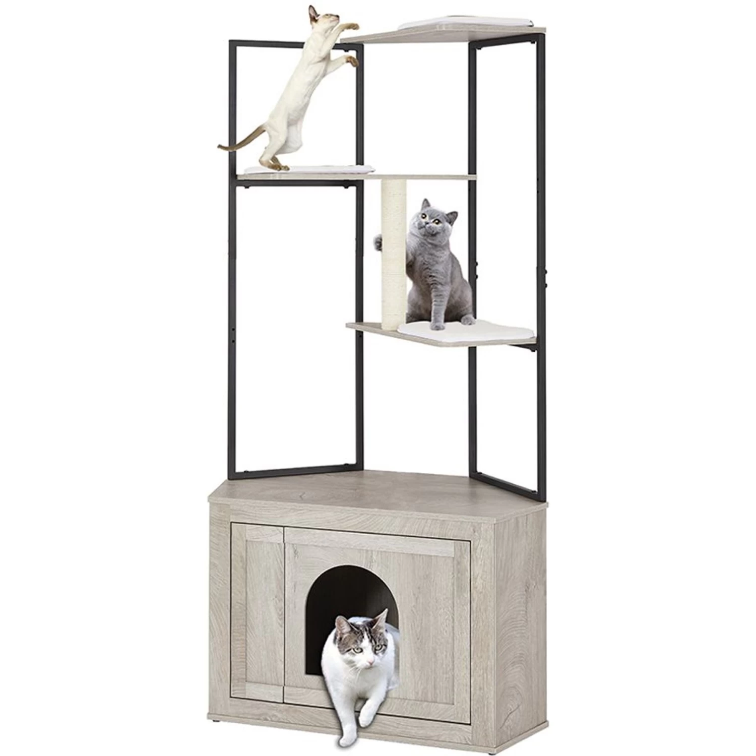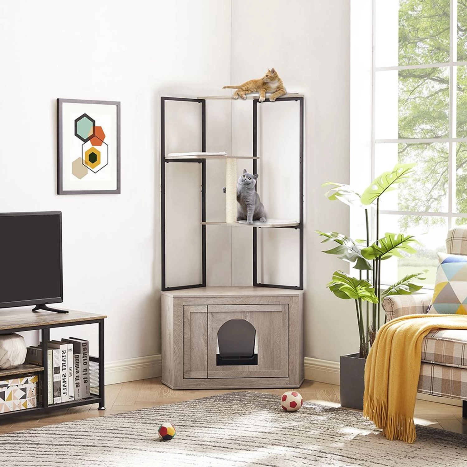 Unipaws Corner Box Enclosure With Cat Tree Tower Cat Litter, Weathered Grey, Medium