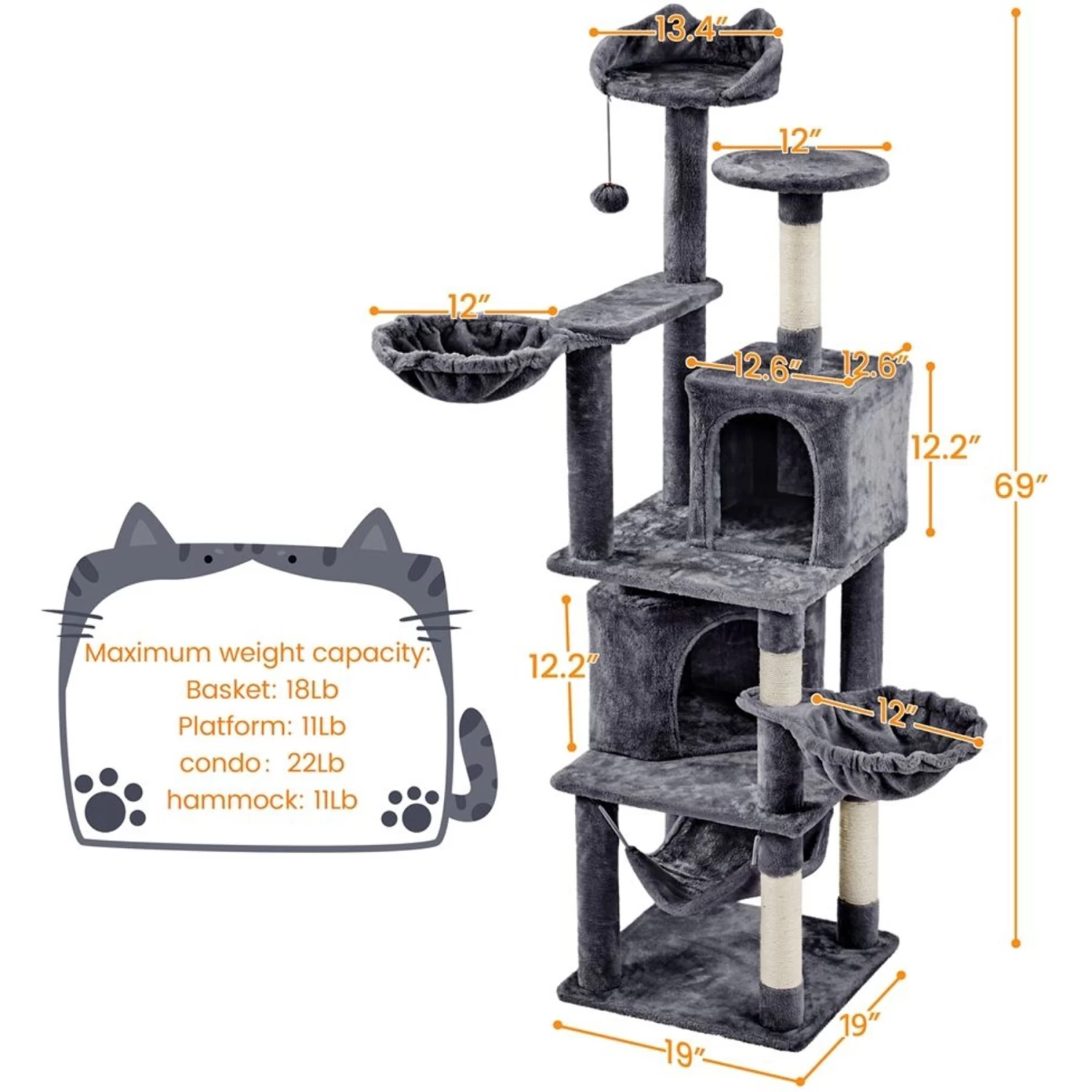 - Features two top plush perches, two roomy cat apartments, plus hammock and basket lounging areas for rest and play.