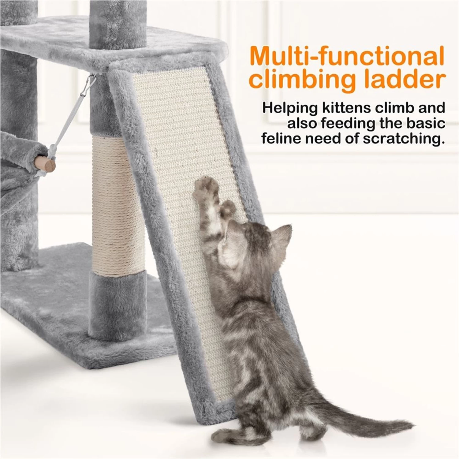 - Features a top perch, spacious condo, hammock and basket so 2 or 3 cats can lounge.